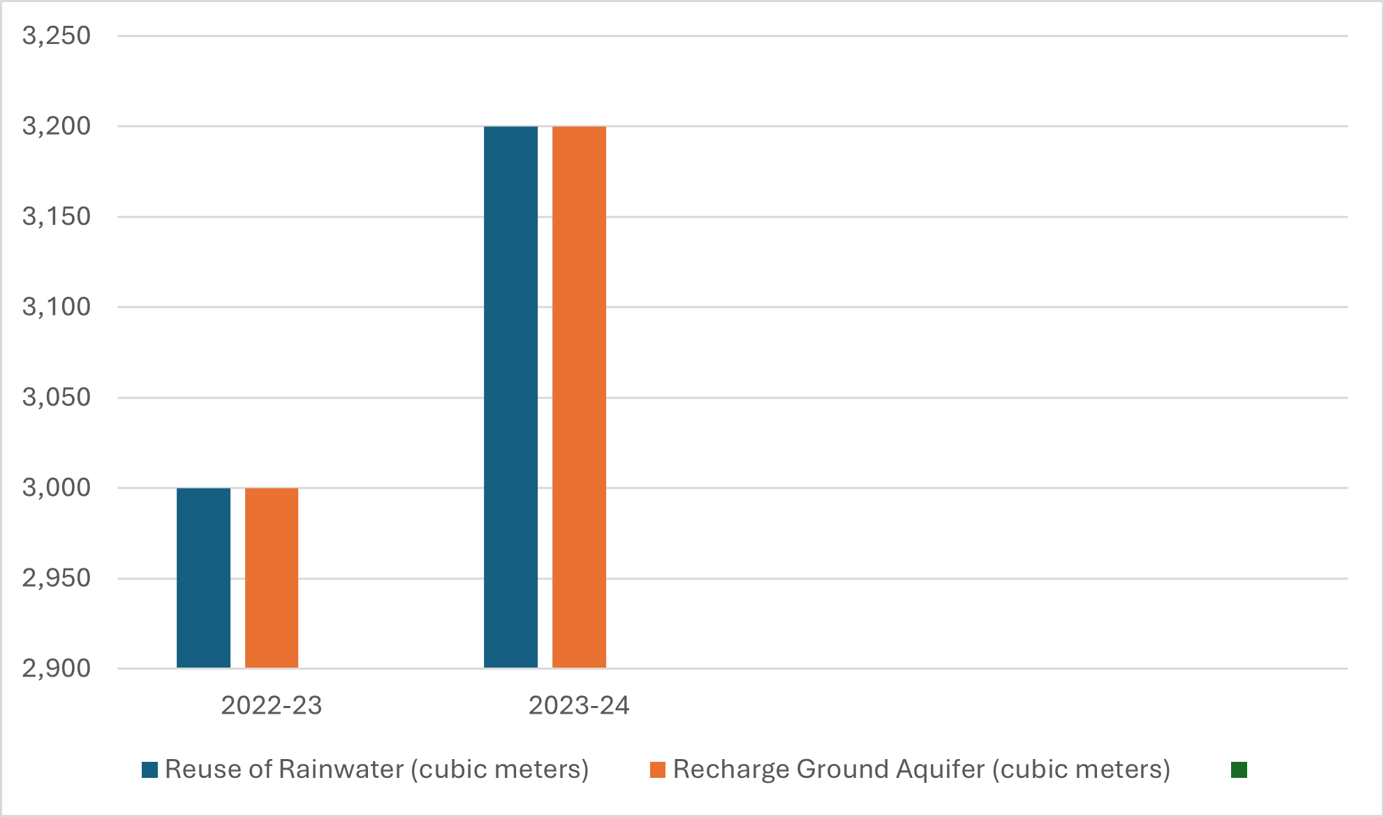 | Year | Reuse of Rainwater (cubic meters) (Approx) | Recharge Ground Aquifer (cubic meters) (Approx) |